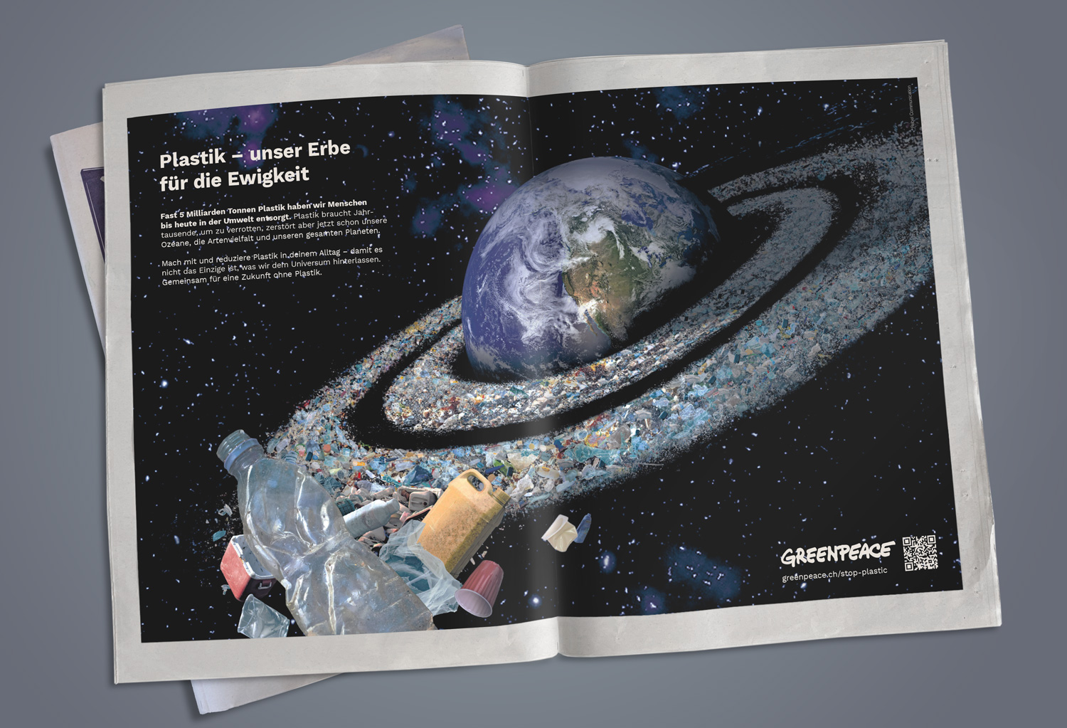 Rebel Communication hat für Greenpeace eine crossmediale Sensibilisierungskampagne realisiert. Mit einer galaktischen Inszenierung unserer Zukunft machte die Kampagne auf das Plastikproblem aufmerksam und lieferte Tipps für die Reduktion von Plastik im Alltag. Den Höhepunkt der Kampagne bildete eine «Flut» von Plastik in Inserateform in der Pendlerzeitung «20 Minuten».