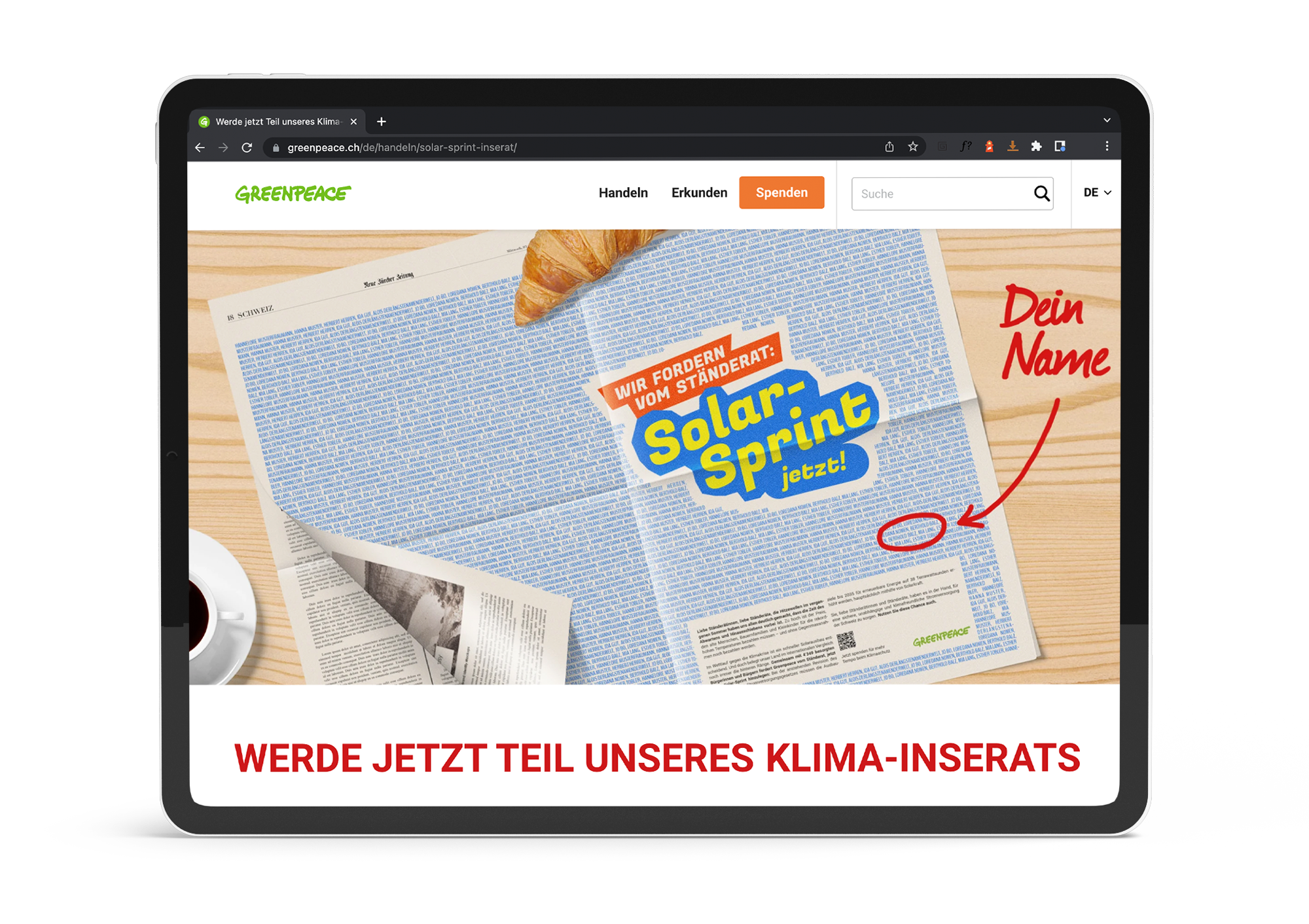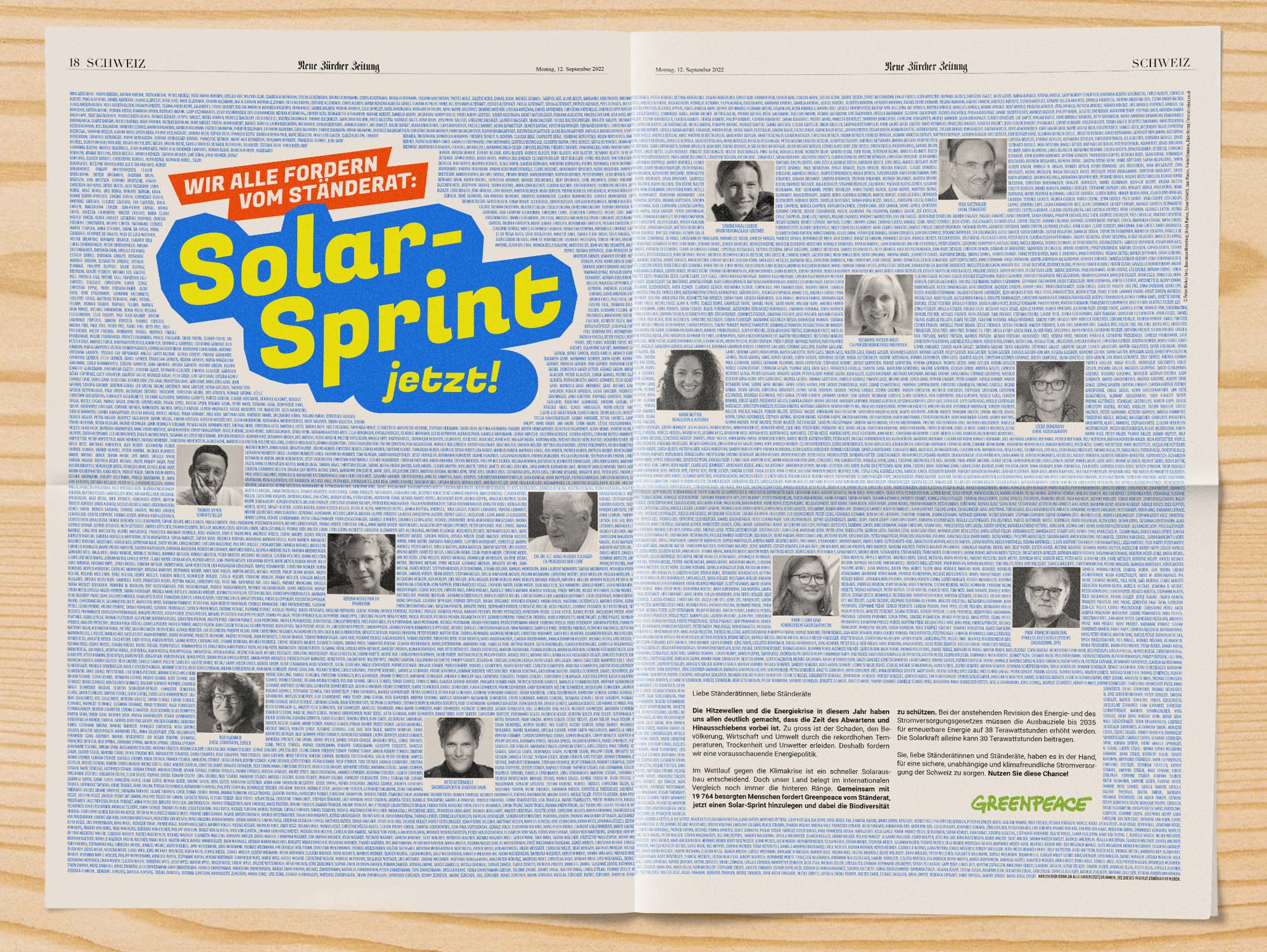 Den Abschluss der Kampagne bildeten Crowd-Inserate, die zum Auftakt der Herbstsession in den Zeitungen NZZ und Le Temps erschienen: Die Unterstützenden der Petition hatten die Möglichkeit, mit ihrem Namen Teil der politischen Forderung zu werden. Damit richtete sich Greenpeace gemeinsam mit den Unterzeichnenden direkt an den Ständerat. Zahlreiche Persönlichkeiten aus Wissenschaft, Gesellschaft und Kultur unterstützten die Forderung nach dem Solar-Sprint.